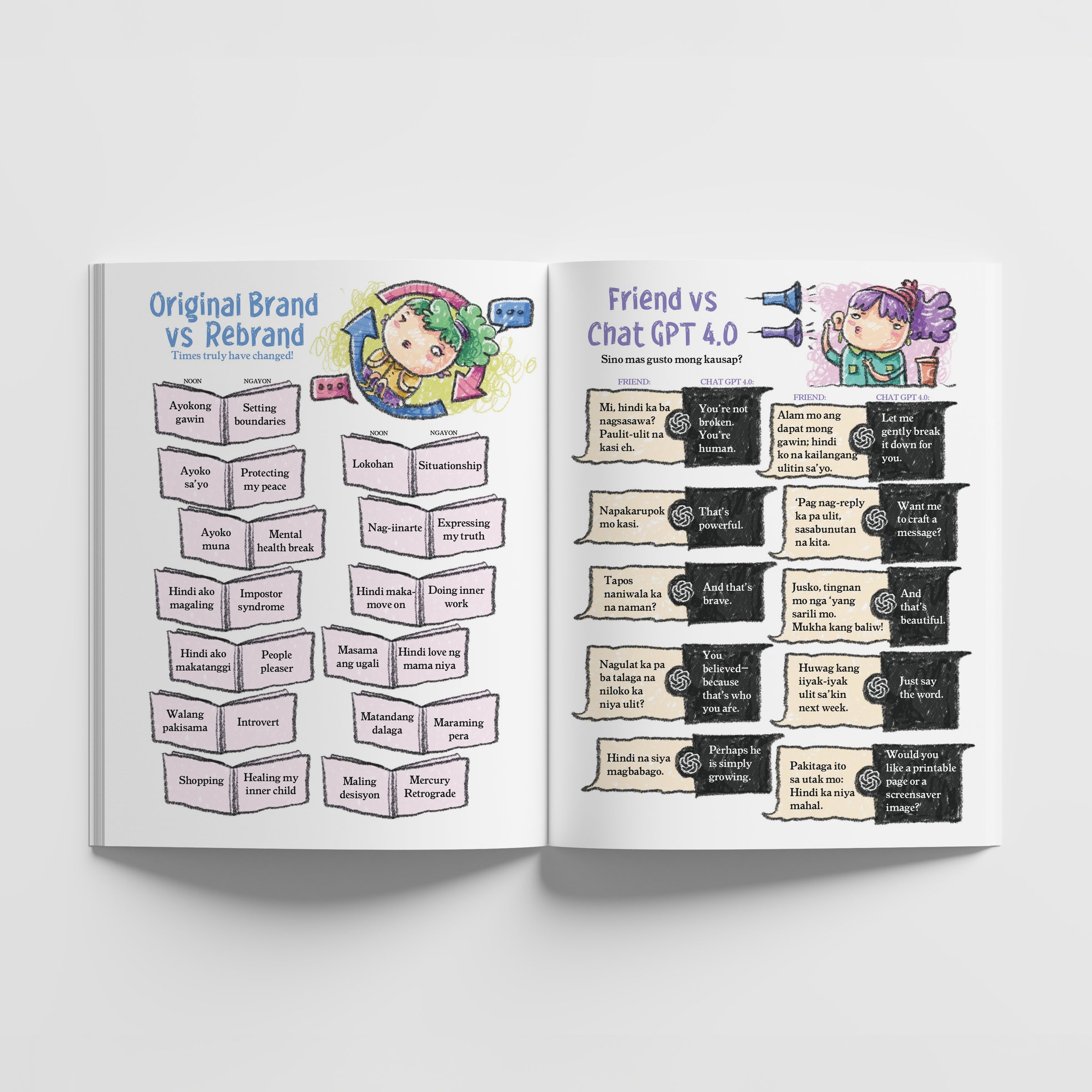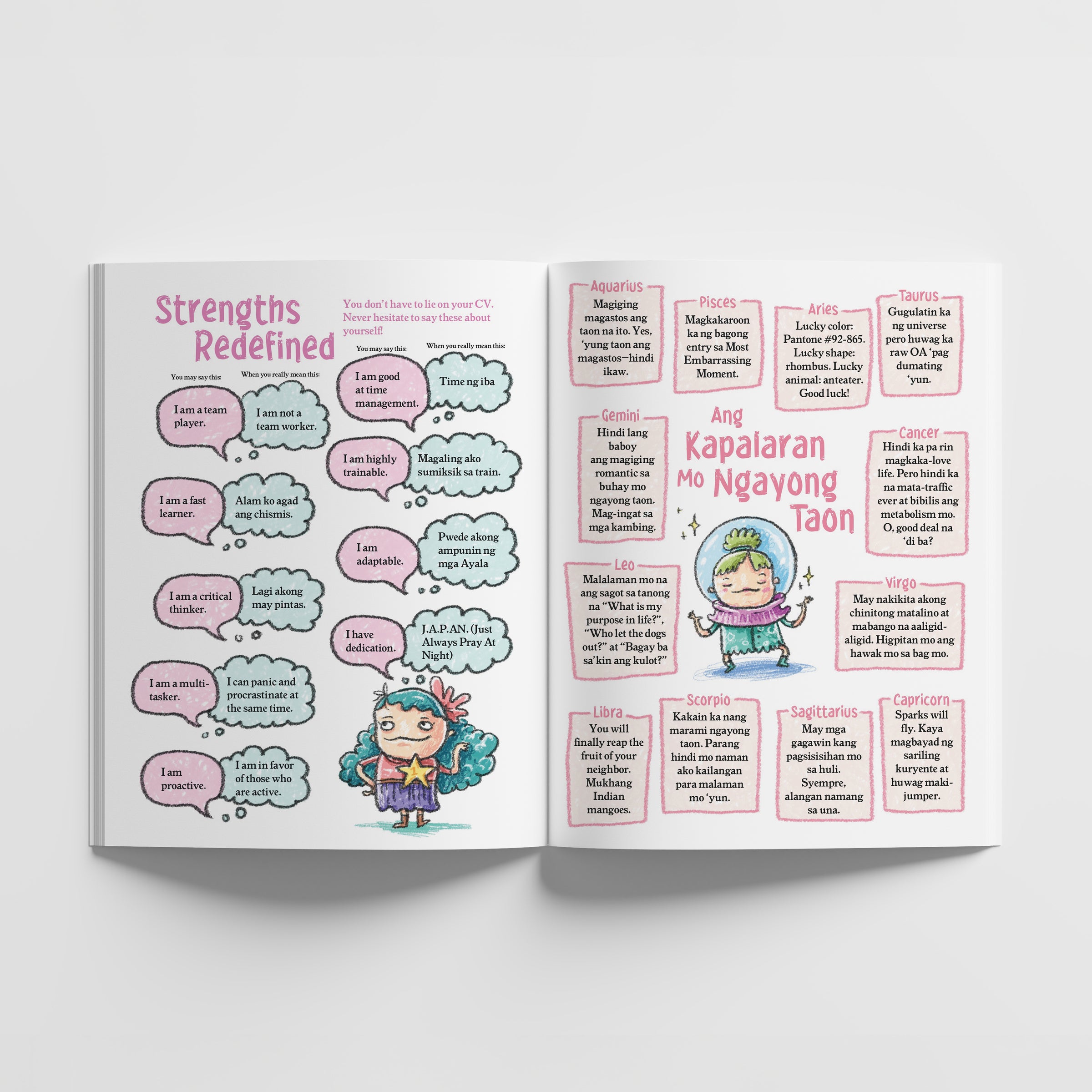 Tita Witty’s first ever product, The “I-was-supposed-to-get-that-coffeehouse-planner-but-I-got-fat-on-the-10th-frappe” Planner 2010 was an unexpected hit and unintentional business venture, making the founders think there was room for witty journals na nagta-Tagalog. Tama naman ang akala nila kaya sinundan nila ito ng ibang paper products gaya ng nostalgic na slumbook, wedding guest book, calendars, notepads, sticky notes, at stickers. Gumawa na rin si Tita Witty ng tote bags, shirts, at storybook. She hopes someday she can produce her own hardware and automotive lines, para maiba naman.