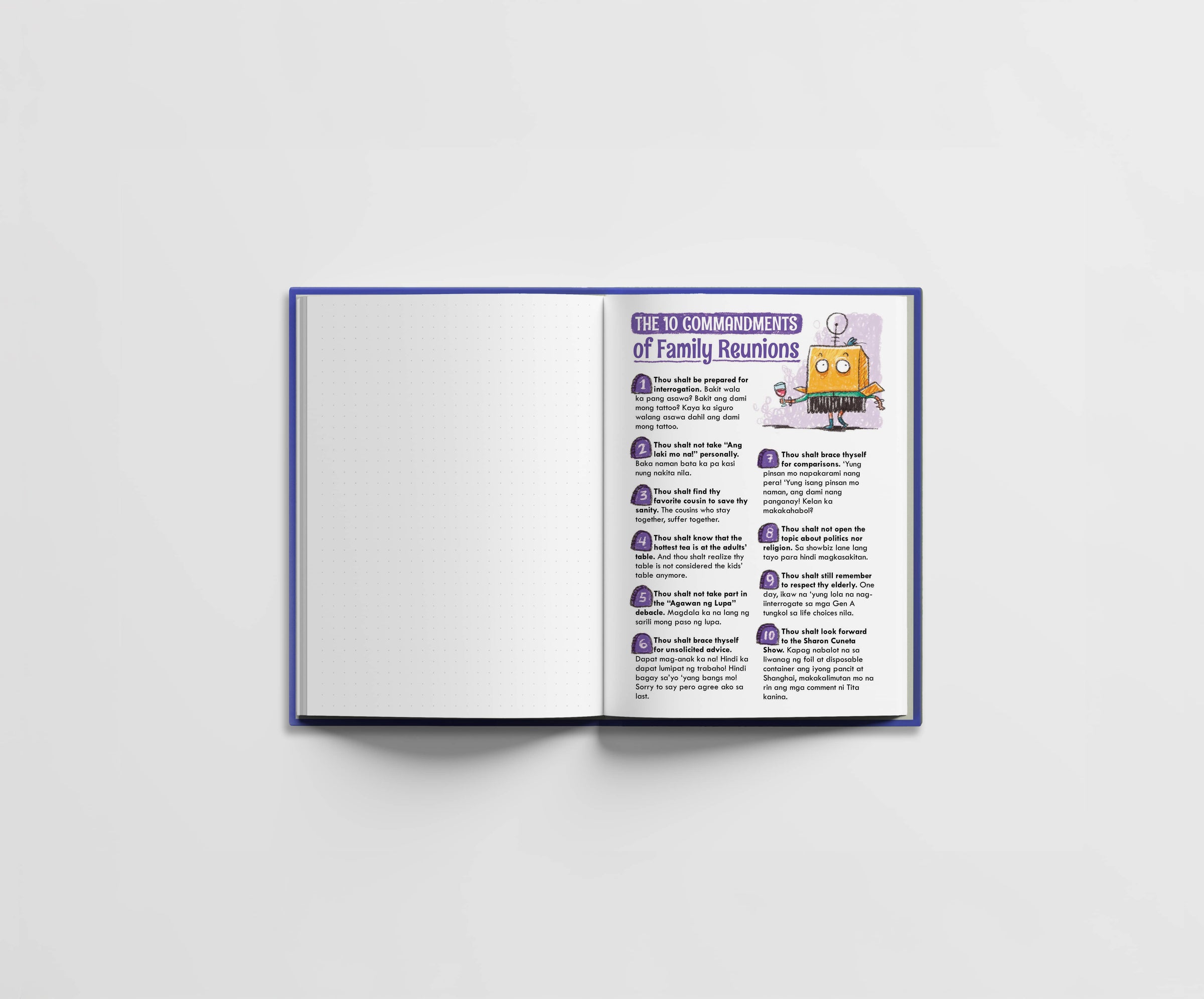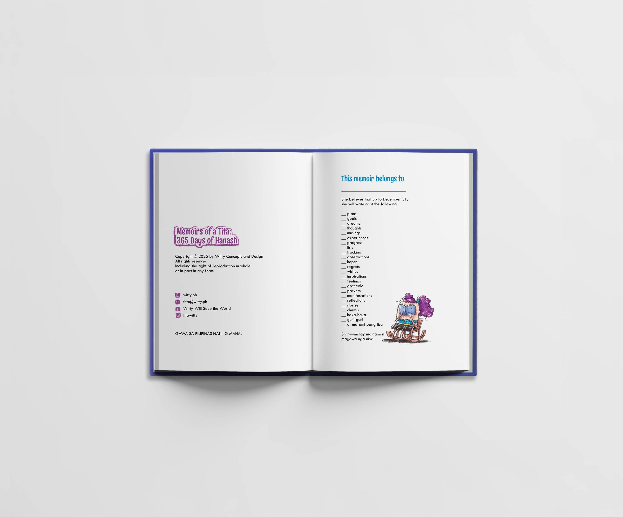 The Diary ng Kwarentahin: Memoirs of a Tita (365 Days of Hanash) is a yearless, one-page-a-day journal with daily prompts, to help you write about your day: