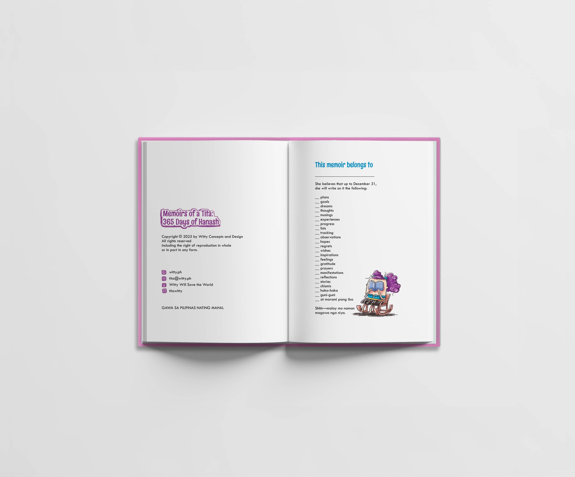 The Diary ng Trentahin: Memoirs of a Tita (365 Days of Hanash) is a yearless, one-page-a-day journal with daily prompts, to help you write about your day: